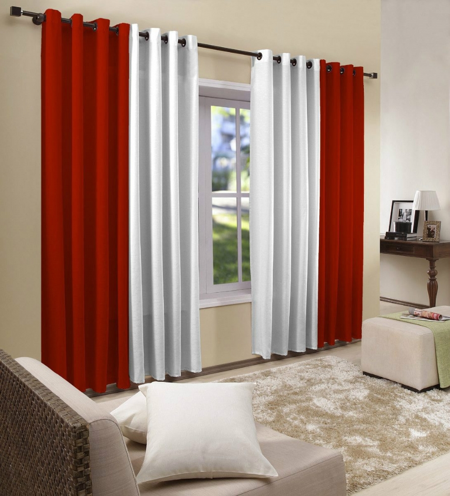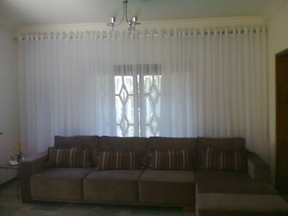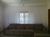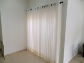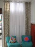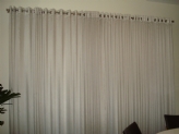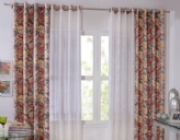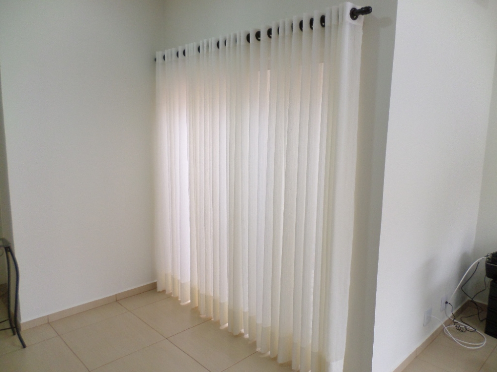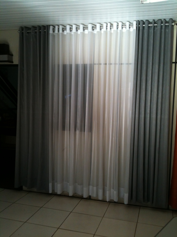 Cortina de Voil com tecido estampado nas laterias. Varão fosco e ilhós quadrado.