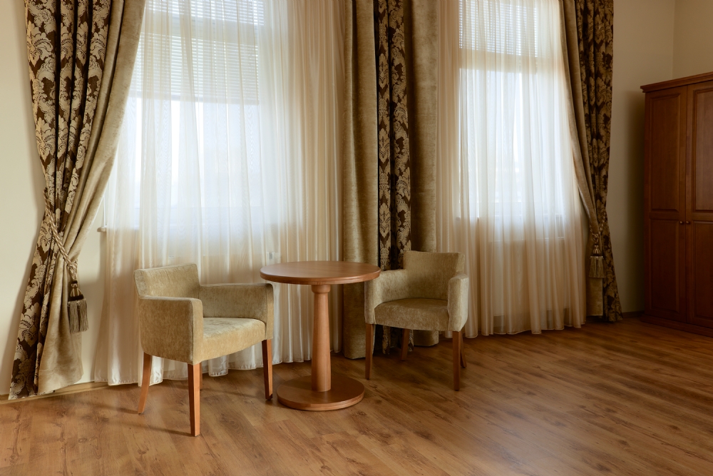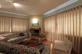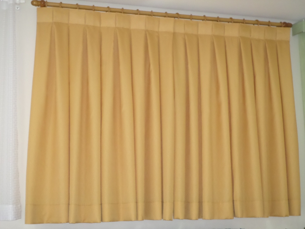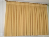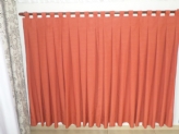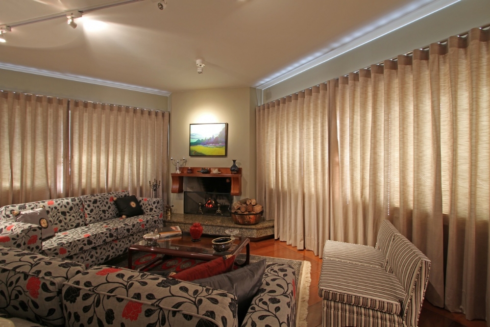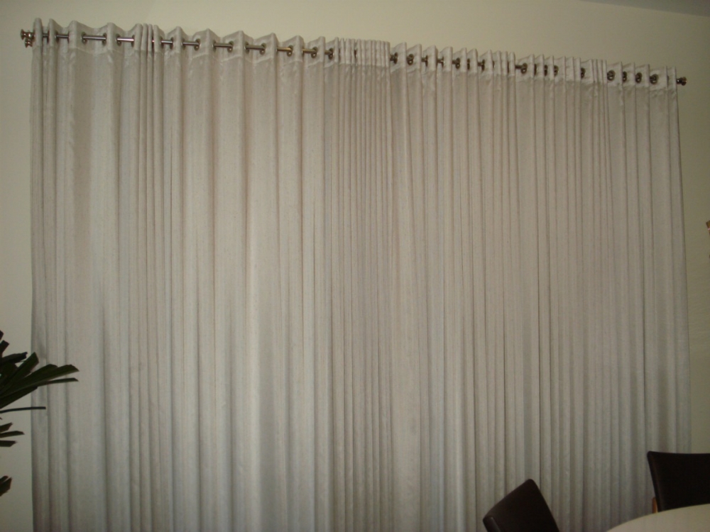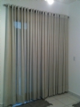 Cortina de tecido com acabamento prega macho e argolas. Varão cerejeira.